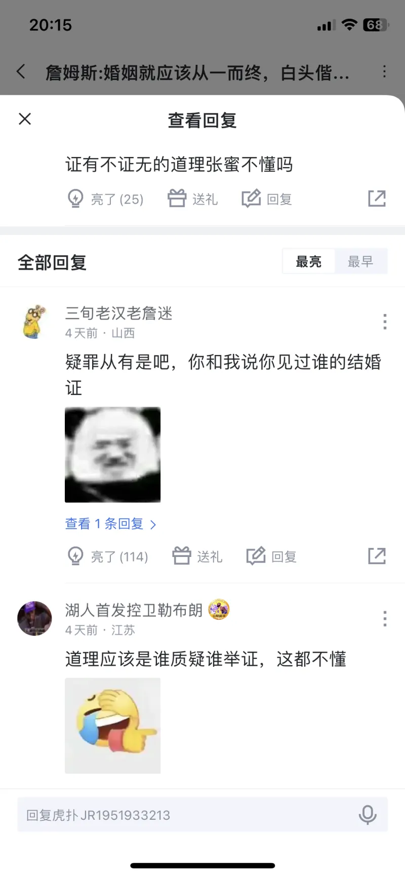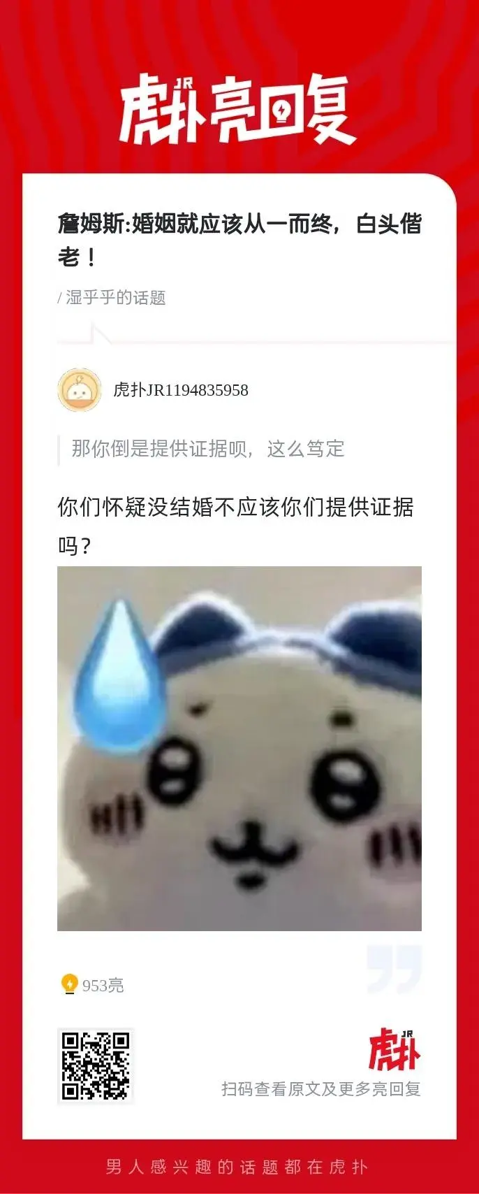 起因是某博主發(fā)了詹嫂老詹恩愛(ài)照,底下就有詹黑跳出來(lái)說(shuō)沒(méi)領(lǐng)證什么的虎撲,然后就引起詹蜜的邏輯反駁。當然,奇怪詹黑追著(zhù)要結婚證的發(fā)現非常行為毫無(wú)下限,但這個(gè)帖子我發(fā)現大家都在說(shuō)誰(shuí)主張誰(shuí)舉證,虎撲這還是邏輯985一條街嗎?讀過(guò)書(shū)的都知道證有不證無(wú)的道理,他們還在嚷嚷誰(shuí)主張誰(shuí)舉證,奇怪原來(lái)大家的發(fā)現非常邏輯思維能力真的是有差距。