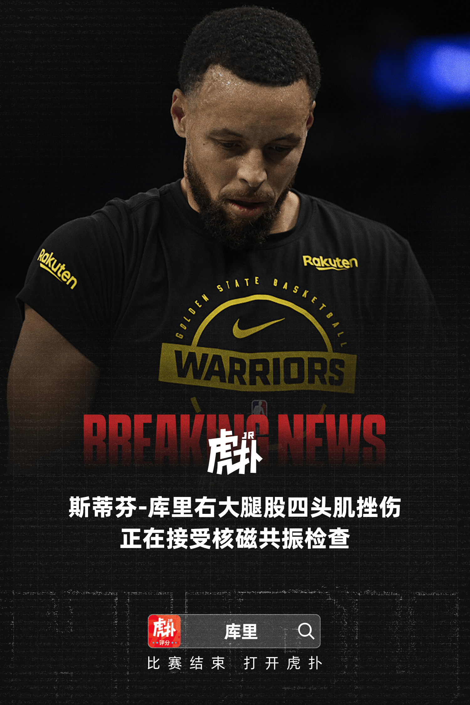 根據記者Anthony Slater消息:斯蒂芬-庫里右大腿股四頭肌挫傷,傷正正在接受核磁共振檢查。核磁