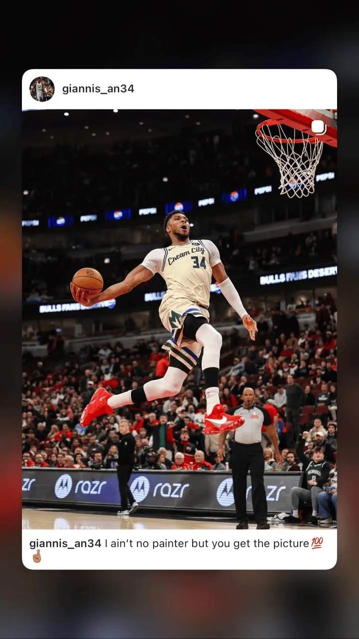 字母賽后社媒分享大風(fēng)車(chē)扣籃照:我不是藝術(shù)家,但你應該明白我的意思,這是一副滿(mǎn)分作品??????。