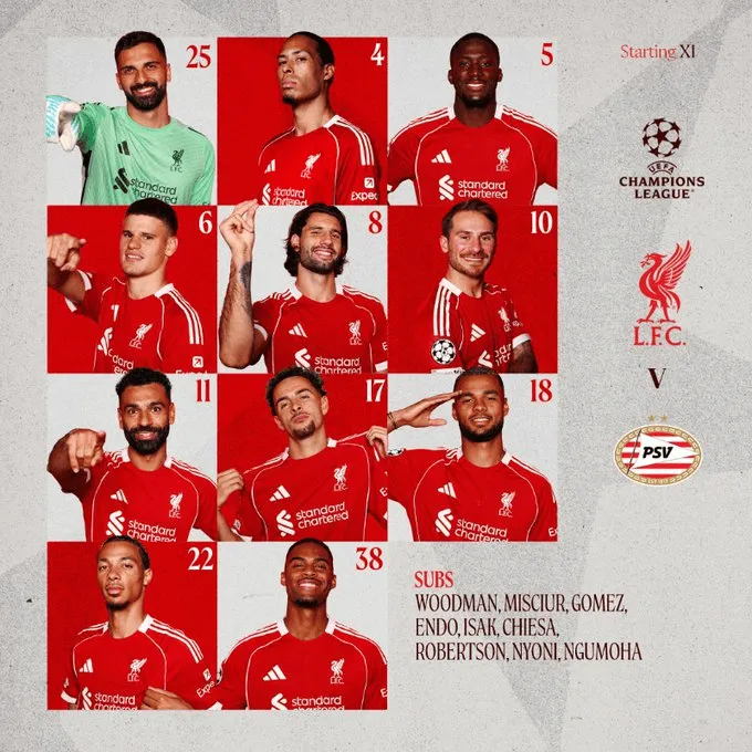 虎撲11月26日訊 歐冠聯(lián)賽第5輪,利物浦主場(chǎng)對陣埃因霍溫。賽前,雙方公布首發(fā)陣容: