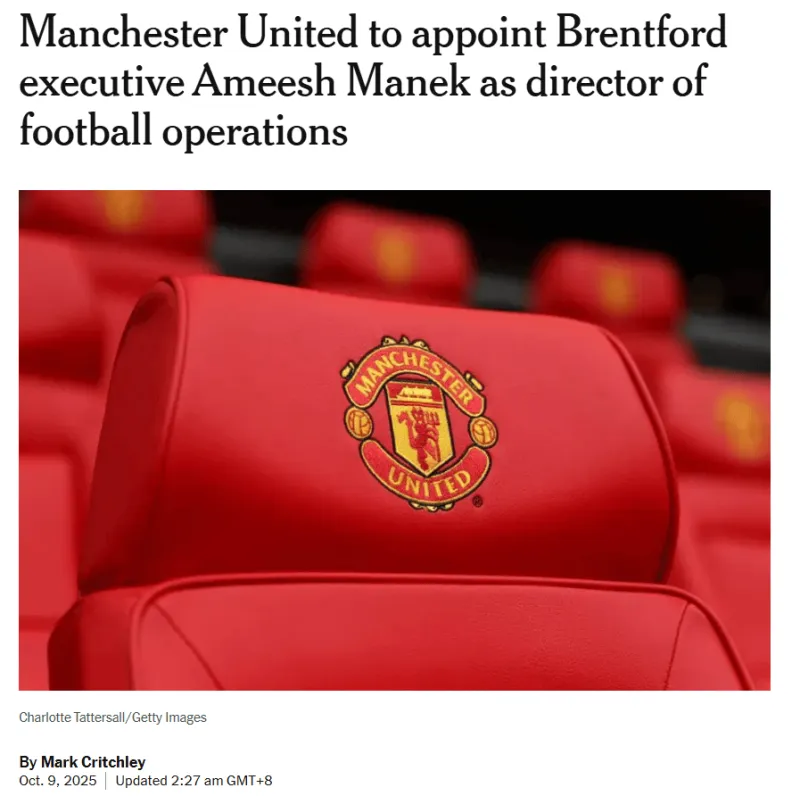 曼聯(lián)即將任命布倫特福德首席運營(yíng)官阿米什?馬內克為新任足球運營(yíng)總監,其任期將于2026年開(kāi)始。月日