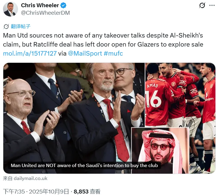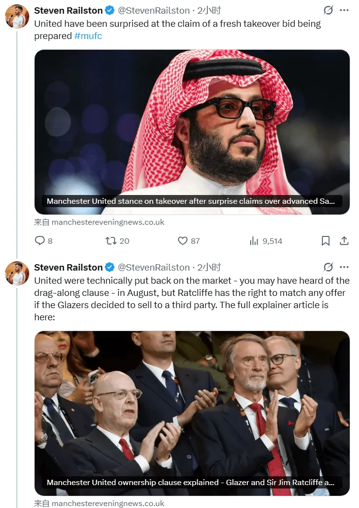 編輯帖子這會(huì )兒,曼晚的Steven Railston,還有郵報的Chris Wheeler發(fā)了差不多的內容,就是曼聯(lián)方面的消息源并沒(méi)有聽(tīng)說(shuō)任何關(guān)于收購談判的消息。