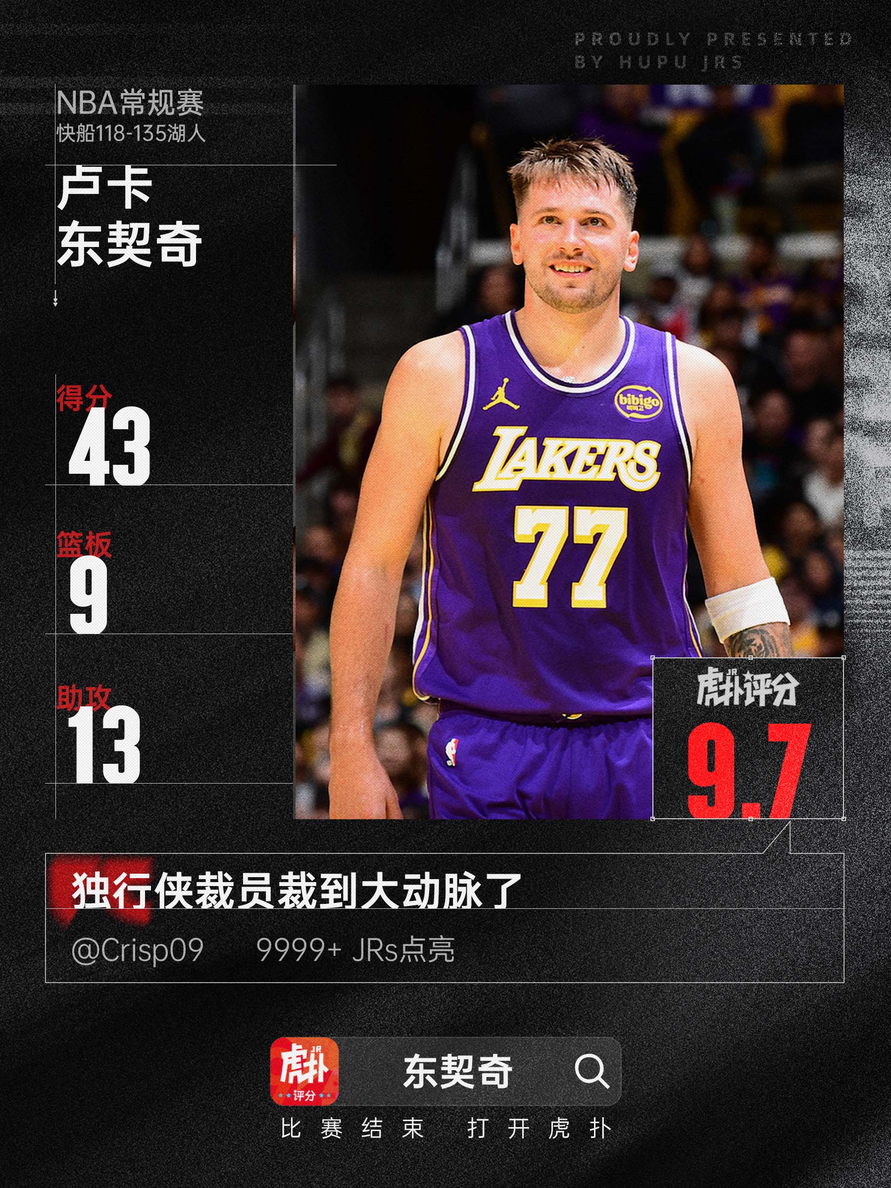 本場(chǎng)比賽,契奇湖人球員盧卡-東契奇出戰38分鐘,28投14中,其中三分球12投7中,罰球11投8中,得到43分9籃板13助攻1搶斷1封蓋。