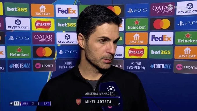 虎撲11月27日訊 阿森納主教練阿爾特塔在3-1擊敗拜仁慕尼黑的歐冠賽后,接受TNT Sport采訪(fǎng)。板阿敗拜
