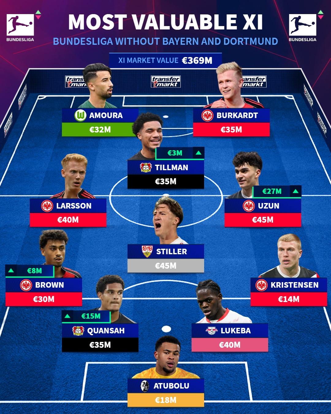 來(lái)源:X虎撲10月14日訊 德國轉會(huì )市場(chǎng)更新德甲球員最新身價(jià),并盤(pán)點(diǎn)德甲除拜仁和多特球員外的最高陣容最高身價(jià)陣容。