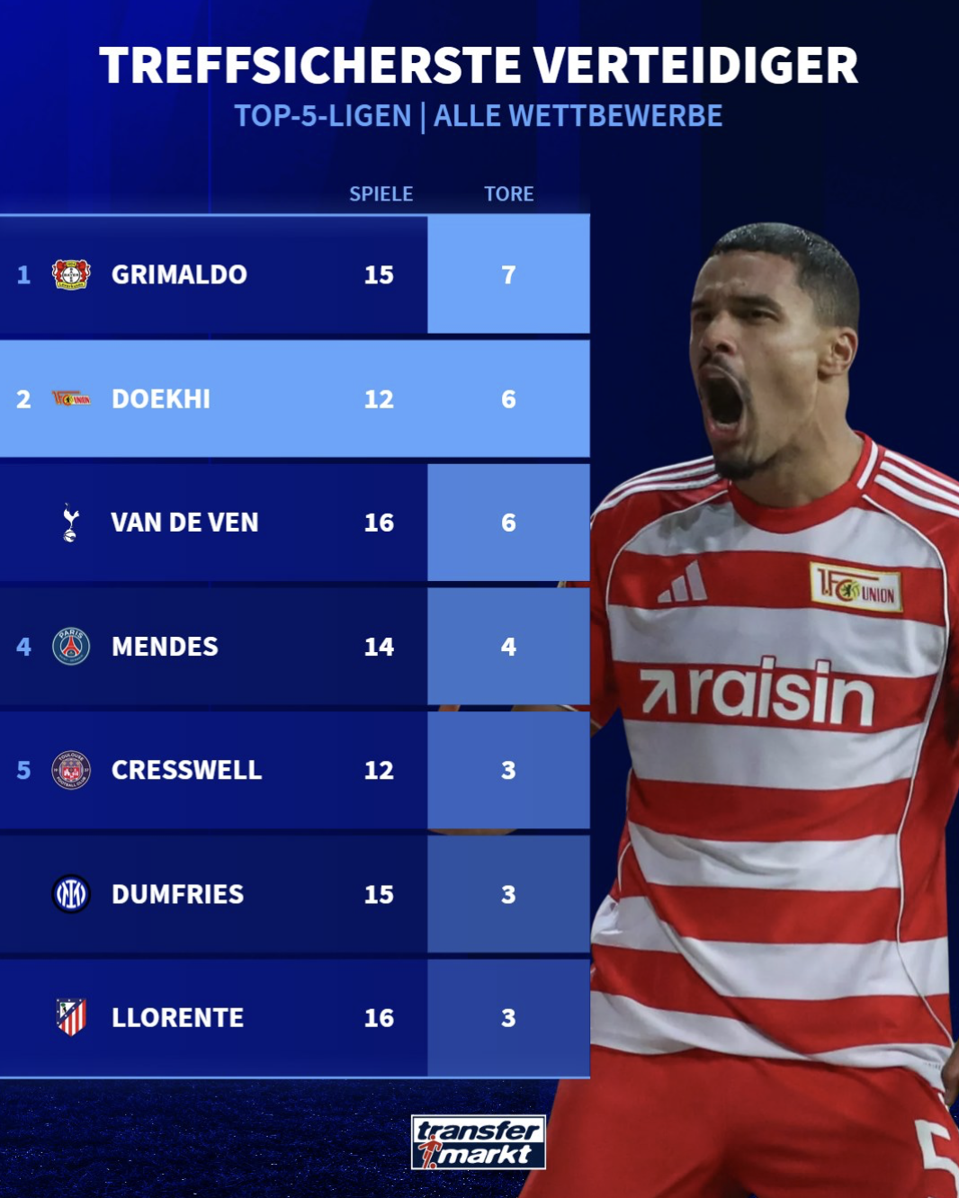 剛過(guò)去的場(chǎng)球德甲第十輪,面對拜仁梅開(kāi)二度的流言聯(lián)賽里馬柏林聯(lián)合后衛多克希在12場(chǎng)比賽中打進(jìn)6球并列第二,僅次于15場(chǎng)打進(jìn)7球的板本榜格勒沃庫森后衛格里馬爾多。