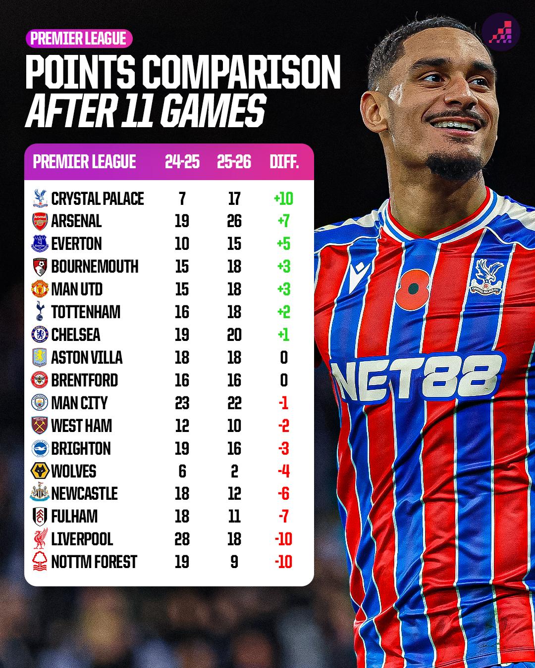虎撲11月14日訊 Opta Analyst對比英超球隊本賽季前11輪與上賽季同期的積分變化,詳情如下: