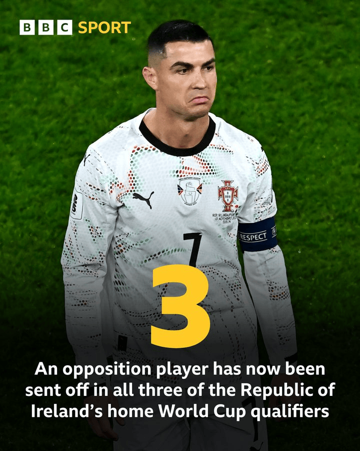 虎撲11月14日訊 世界杯歐洲區預選賽第五輪,愛(ài)爾蘭在主場(chǎng)2-0戰勝葡萄牙,世預賽的賽都C羅被罰出場(chǎng)。個(gè)主