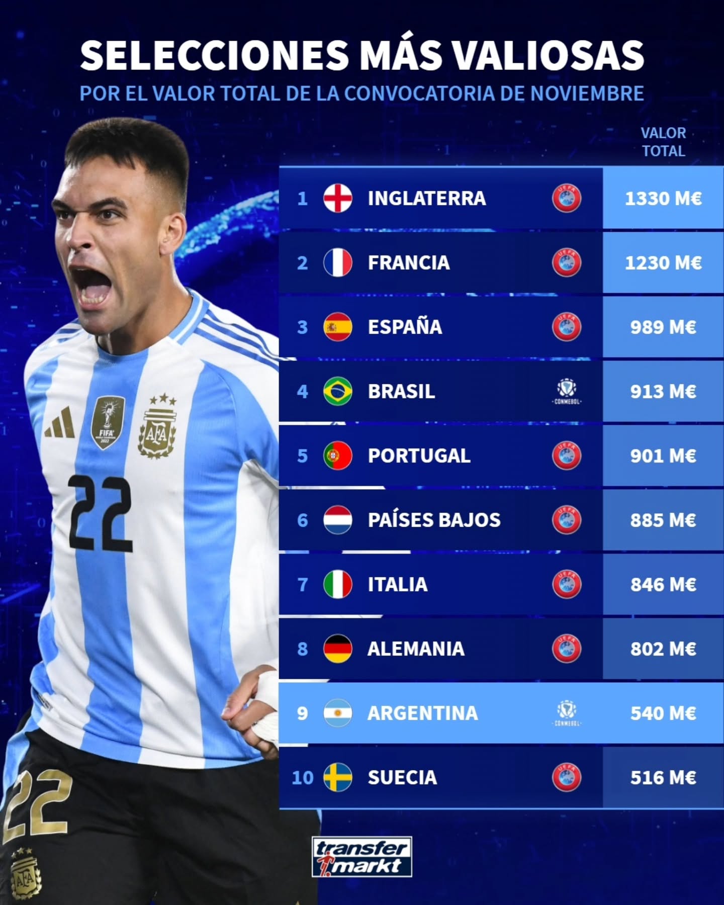 [流言板]本期身價(jià)最貴的國家隊:英格蘭13.3億歐居首,阿根廷排第九