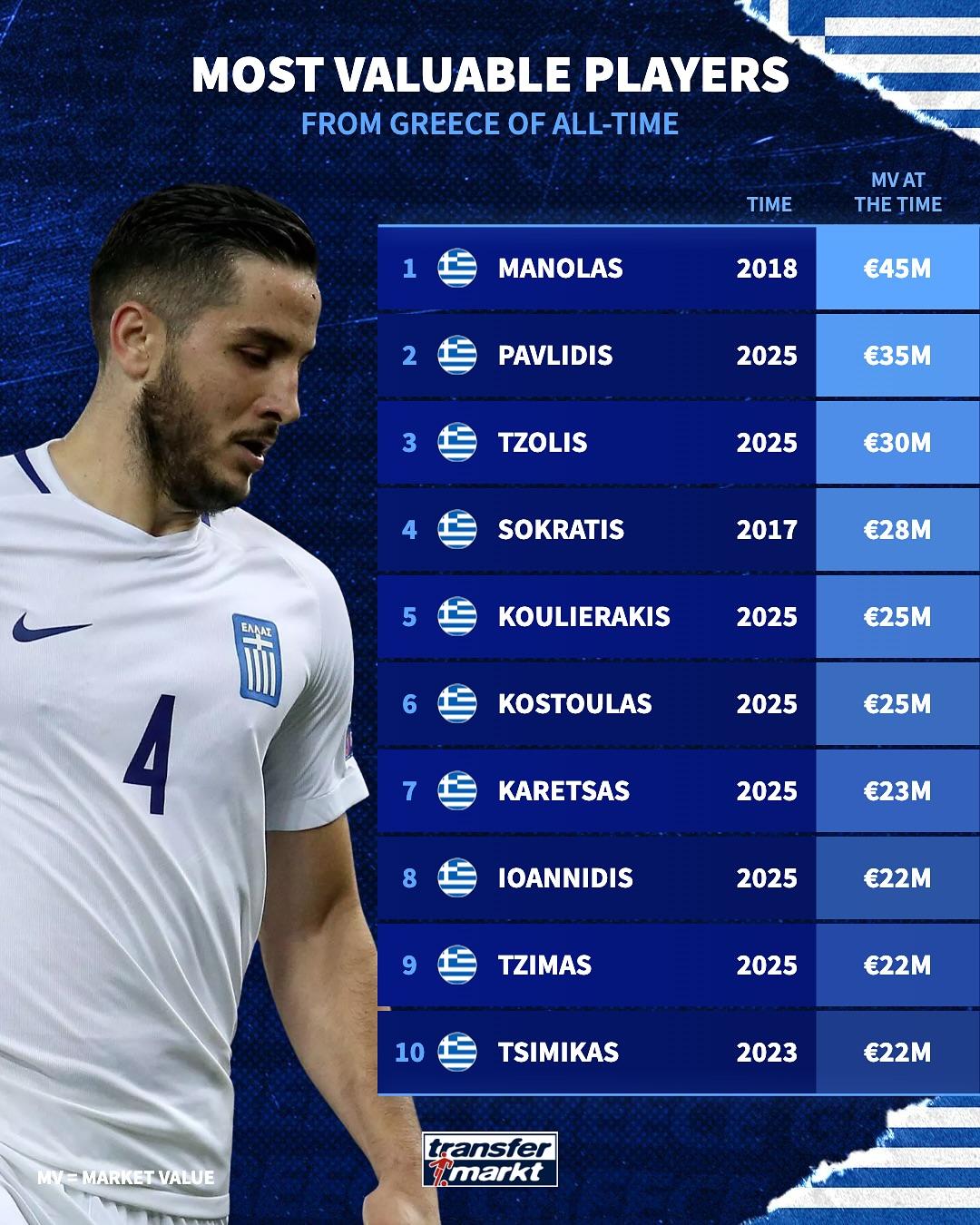 [流言板]希臘球員歷史最高身價(jià):馬諾拉斯45M歐居首,流言臘球齊米卡斯進(jìn)前10由虎撲足球資訊 發(fā)表在國際足球資訊 https://bbs.hupu.com/482