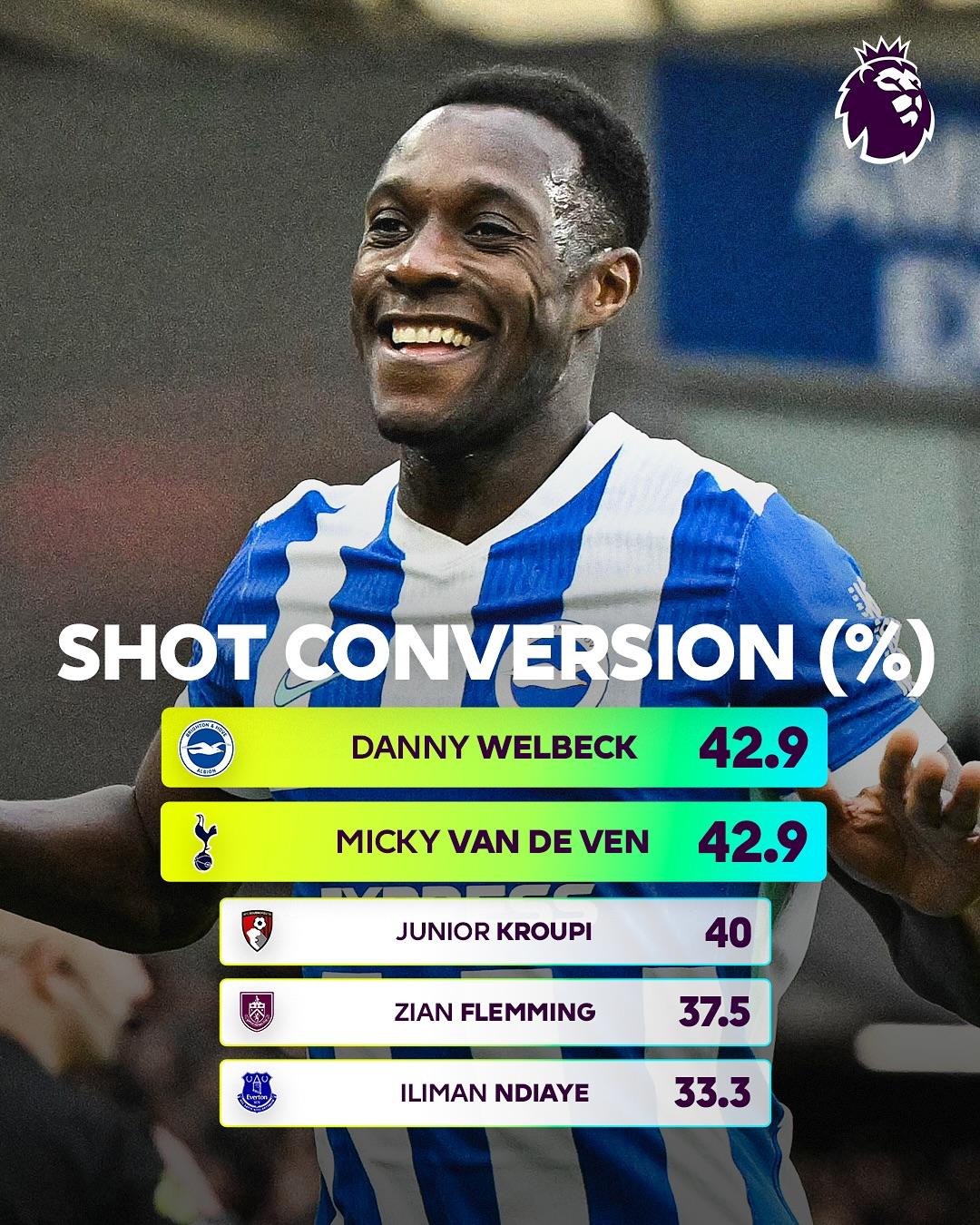 [流言板]本賽季英超球員射門(mén)轉化率:維爾貝克、流言率范德芬并列第一由虎撲足球資訊 發(fā)表在國際足球資訊 https://bbs.hupu.com/482