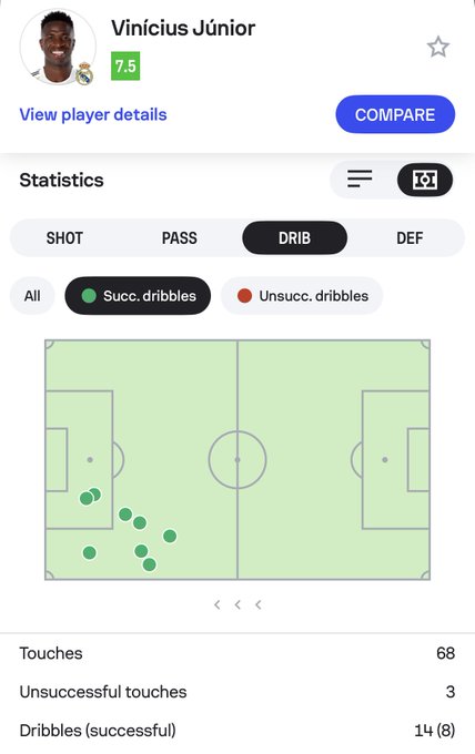 數據統計,場(chǎng)次成功場(chǎng)最維尼修斯在本場(chǎng)比賽中完成8次成功過(guò)人,過(guò)人冠生高紀這是追平他自上賽季以來(lái)單場(chǎng)比賽過(guò)人次數最多的一場(chǎng)。