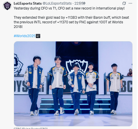 虎撲10月17日訊 LOL賽事數據官推發(fā)布一則新的國際賽事記錄,以下是通過(guò)具體內容: