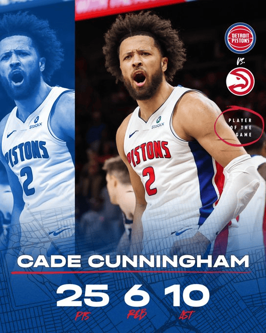 本場(chǎng)比賽,活塞球員凱德-坎寧安出戰33分鐘,23投10中,其中三分球7投1中,罰球4投4中,得到25分6籃板10助攻2搶斷。