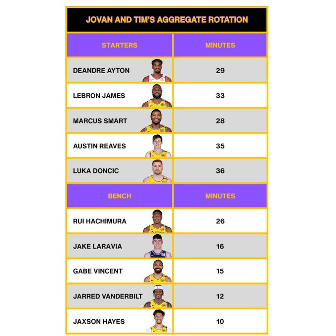 來(lái)源:X虎撲08月08日訊 今日,Jovan Buha更新社交媒體,測湖曬出對于湖人新賽季輪轉時(shí)間的人新人輪預測。