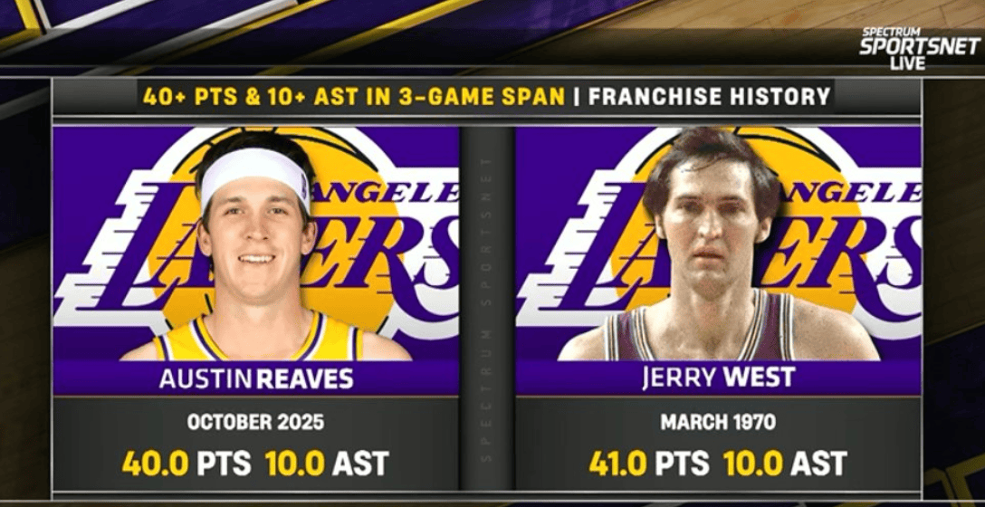 最近3場(chǎng)比賽,里夫斯場(chǎng)均得到40分10助攻,他成為湖人隊史自從1970年的杰里-韋斯特(3戰場(chǎng)均41分10助攻)之后,首位在常規賽3場(chǎng)比賽區間內場(chǎng)均40+得分10+助攻的球員。
