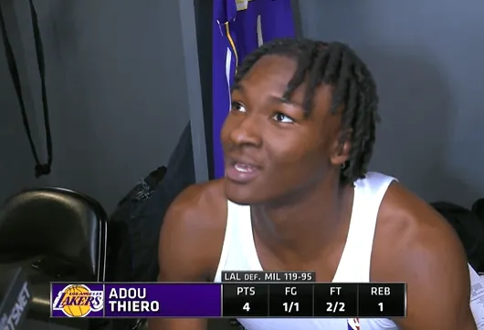 本場(chǎng)比賽,起初湖人球員阿杜-蒂耶羅出戰4分鐘,投籃1中1得到4分1籃板。