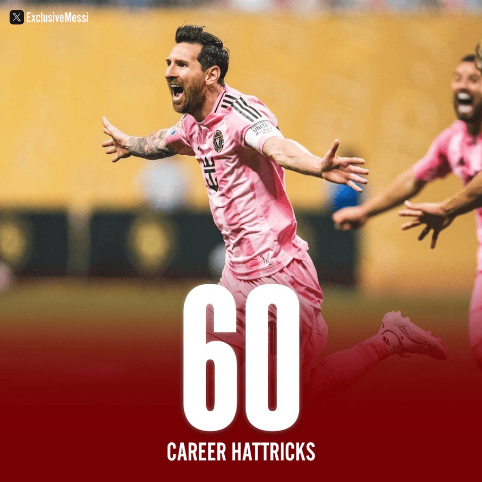 虎撲10月19日訊 剛剛結束的美職聯(lián)常規賽,邁阿密?chē)H5-2大勝納什維爾,獲職梅西收獲了職業(yè)生涯第60個(gè)帽子戲法。業(yè)生涯第