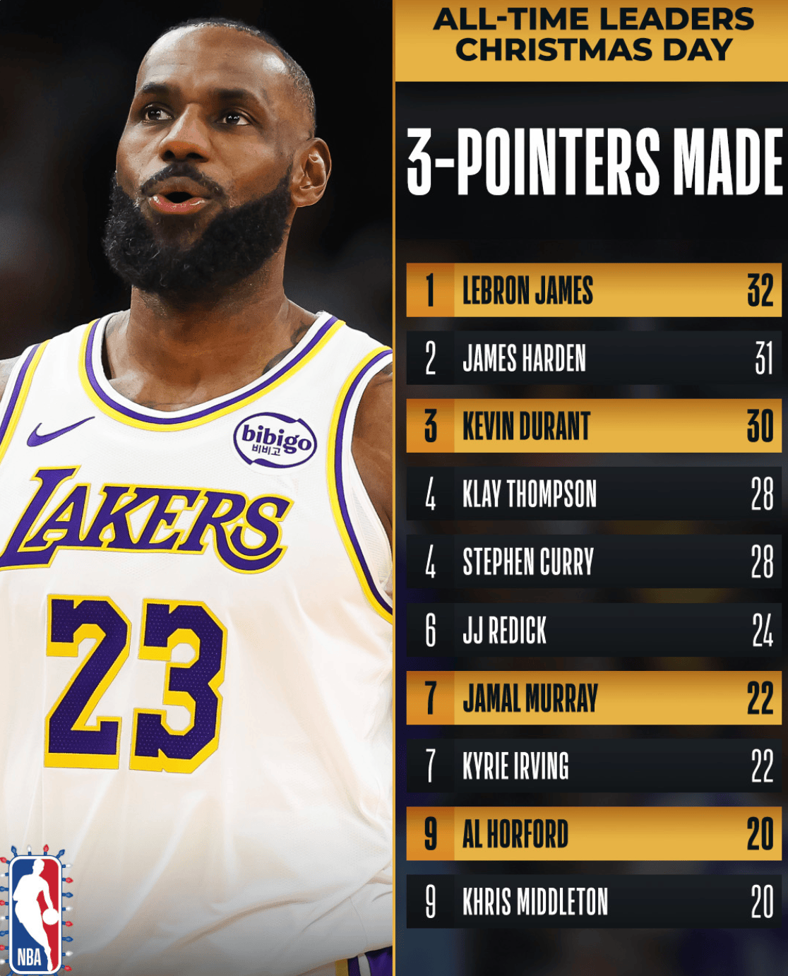 [流言板]詹姆斯升至圣誕大戰三分榜第1,杜蘭特3,默里7,霍福德9