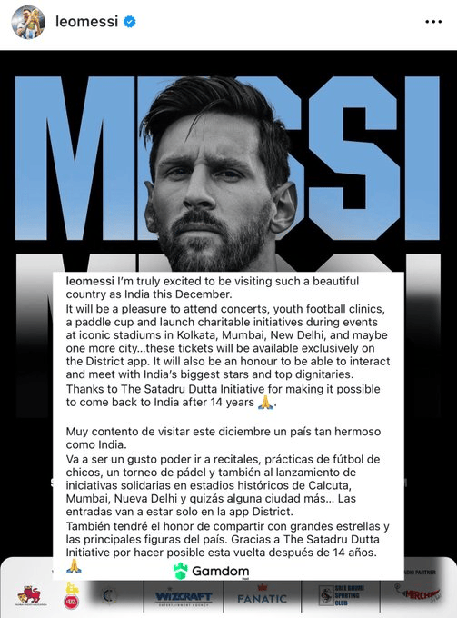 我很榮幸能參加音樂(lè )會(huì )、于今印度青少年足球訓練營(yíng)、年月一次籠式網(wǎng)球的造訪(fǎng)杯賽,并在加爾各答、加系孟買(mǎi)、善活新德里以及其他城市的流言列慈標志性體育場(chǎng)館舉辦的活動(dòng)期間發(fā)起慈善活動(dòng)……