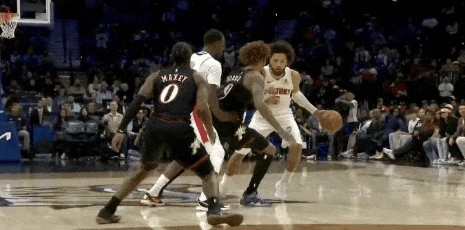 第四節比賽中,坎寧安突破擺脫烏布雷,迎著(zhù)德拉蒙德上演炸裂隔扣。