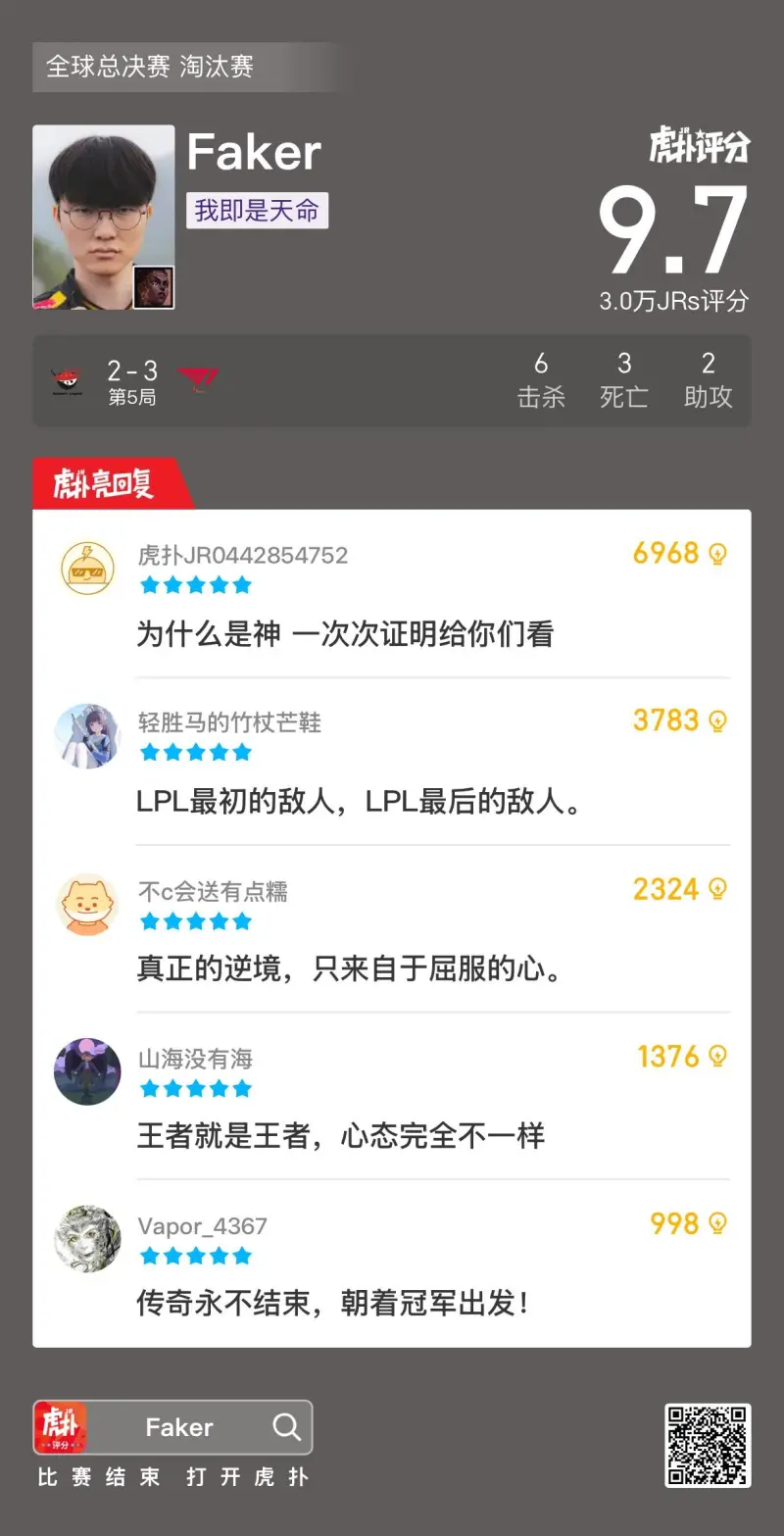 [流言板]英雄聯(lián)盟賽事評分人次超100W,超3萬(wàn)JRs給Faker打出9.7分