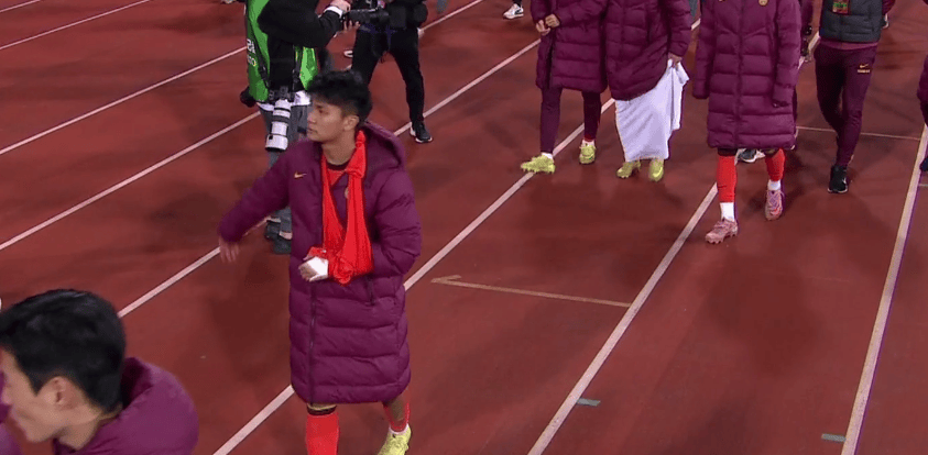 虎撲11月18日訊 在熊貓杯對陣烏茲別克斯坦U22的賽后謝場(chǎng)時(shí),中國U22球員蒯紀聞左手纏著(zhù)繃帶。情略且綁