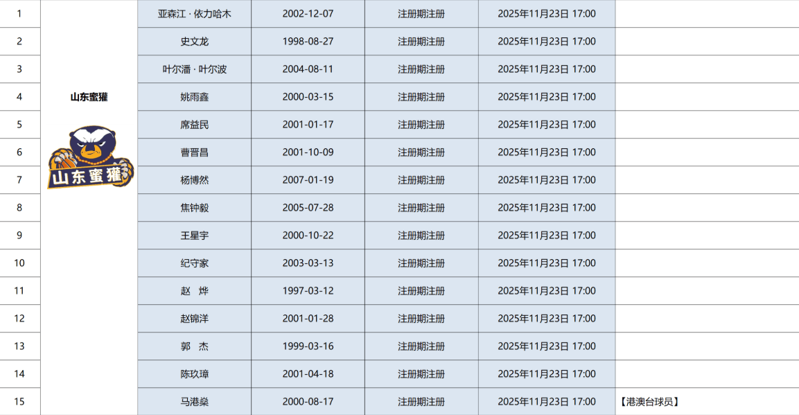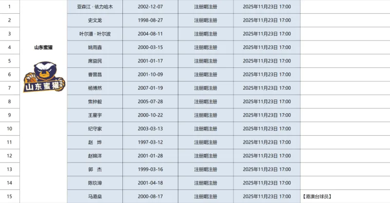 虎撲11月22日訊 深藍體育官方公布新賽季NBL山東蜜獾隊注冊信息。