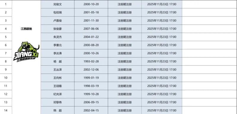 劉俊文、江西包校瑞、贛馳國內盧嘉駿、注冊張俊豪、信息朱靈杰、翊雄李曹北、流言列李炎濤、板N彬王楊越、江西王叢澤、贛馳國內王向彬、注冊王翊雄、信息紀光澤、翊雄鄧黎偉、流言列韓超。