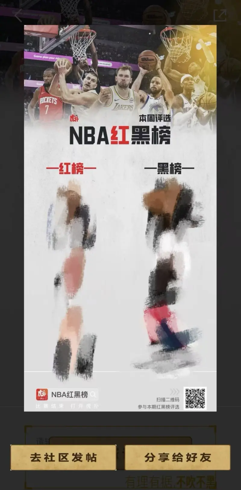 也可點(diǎn)擊“分享給好友”,表現榜球別選將你評選出的亮眼本周紅黑榜分享至站外,與身邊球迷好友們一同探討!