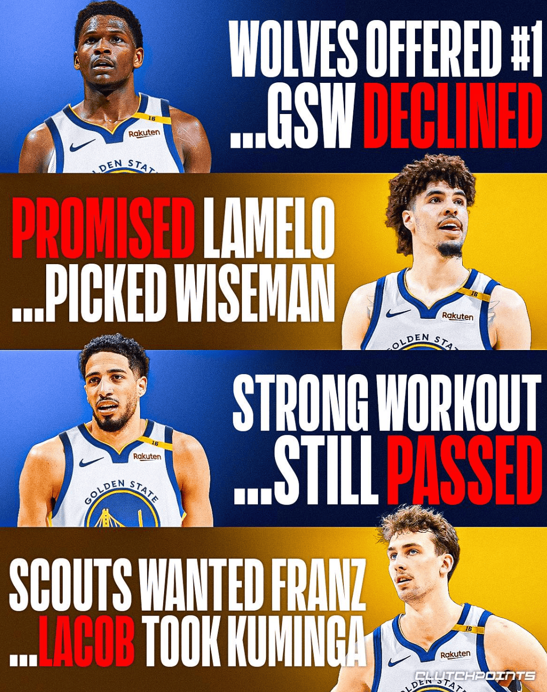 據報道,2020年,森林狼曾試圖將狀元簽交易給勇士。但勇士拒絕了,之后森林狼選中安東尼-愛(ài)德華茲,而勇士則在第2順位選中詹姆斯-懷斯曼。