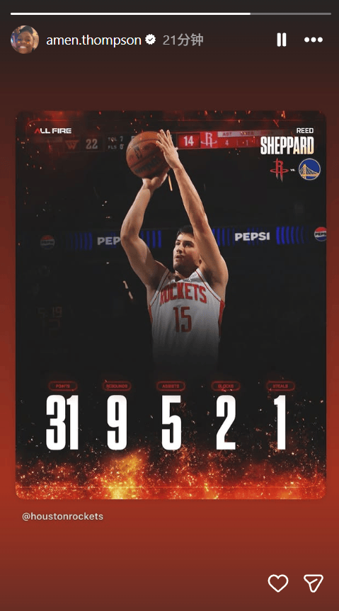 賽后,阿門(mén)-湯普森在社交媒體上轉發(fā)了謝潑德本場(chǎng)比賽的數據海報。
