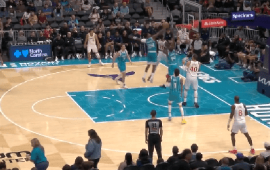 第三節比賽,空切科林斯空切接球強起飛身上籃,接球遭布蘭登-米勒追身大帽扇飛。強起