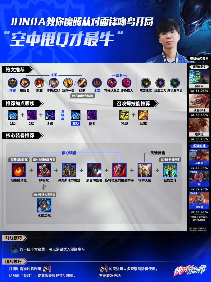 CFO.JunJia的篇?「永恒夢(mèng)魘 魔騰」教你奇招制勝,利用好1級的界賽絕活強勢期從對面鋒喙鳥(niǎo)開(kāi)局,定下你的選手節奏在對方打野之上的基調,接下來(lái)該發(fā)育發(fā)育該關(guān)燈關(guān)燈一氣呵成!板快