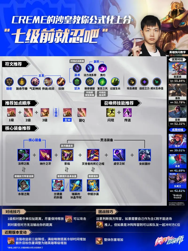 TES.Creme的「沙漠皇帝 阿茲爾」上分寶典勸你前期別浪,只要忍到7級再發(fā)起進(jìn)攻,一切都會(huì )好起來(lái)的,至于團戰能不能沖上去推人,要看自家整體陣容。