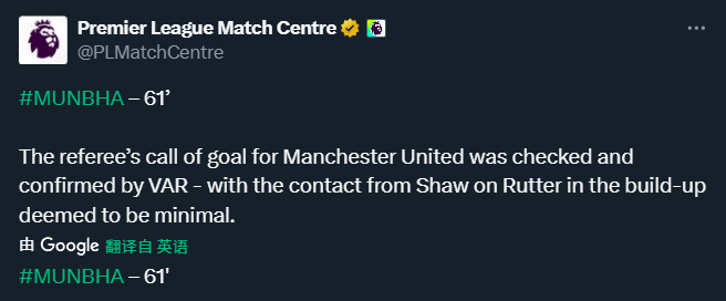 “裁判確認曼聯(lián)進(jìn)球的對呂判罰經(jīng)過(guò)VAR的核實(shí)和確認——肖在進(jìn)攻過(guò)程中與呂特的身體接觸被認為微乎其微?!?/p>