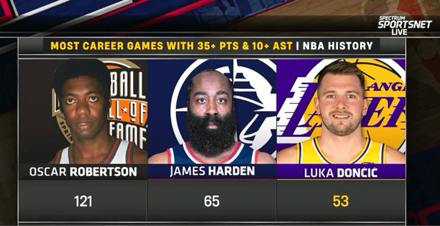 根據數據統計,東契奇生涯第53次砍下35分+10助攻,歷史第三僅次于大O和哈登。
