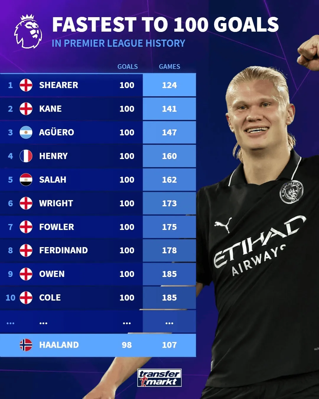 虎撲11月03日訊 德轉市場(chǎng)(Transfermarkt)盤(pán)點(diǎn)了英超歷史上最快打進(jìn)100球的球員榜單,曼城前鋒哈蘭德目前以107場(chǎng)打入98球的希勒成績(jì)逼近這一紀錄,有望在本賽季改寫(xiě)歷史。首哈