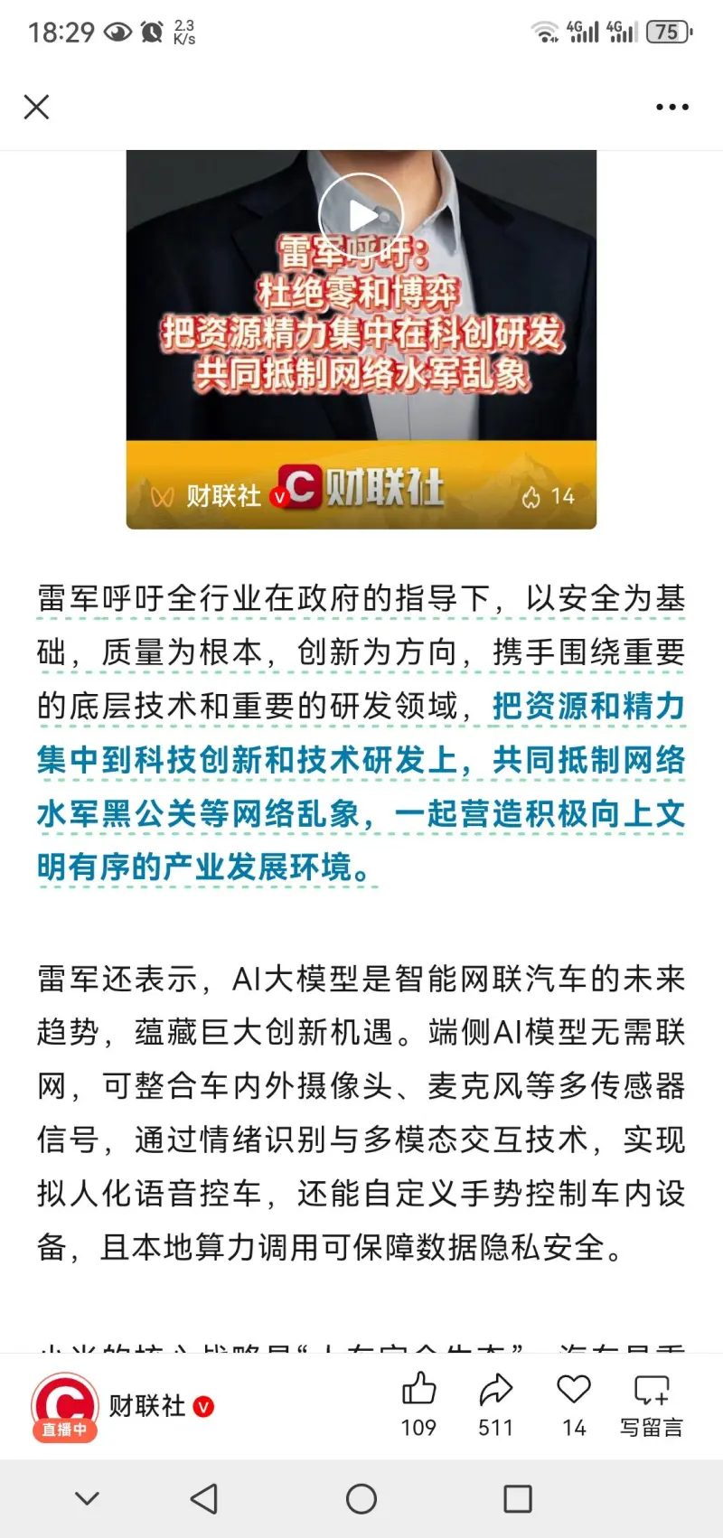雷軍表示,應把資源和精力集中到科技創(chuàng )新和技術(shù)研發(fā)上,共同抵制網(wǎng)絡(luò )水軍黑公關(guān)等網(wǎng)絡(luò )亂象,一起營(yíng)造積極向上文明有序的產(chǎn)業(yè)發(fā)展環(huán)境。