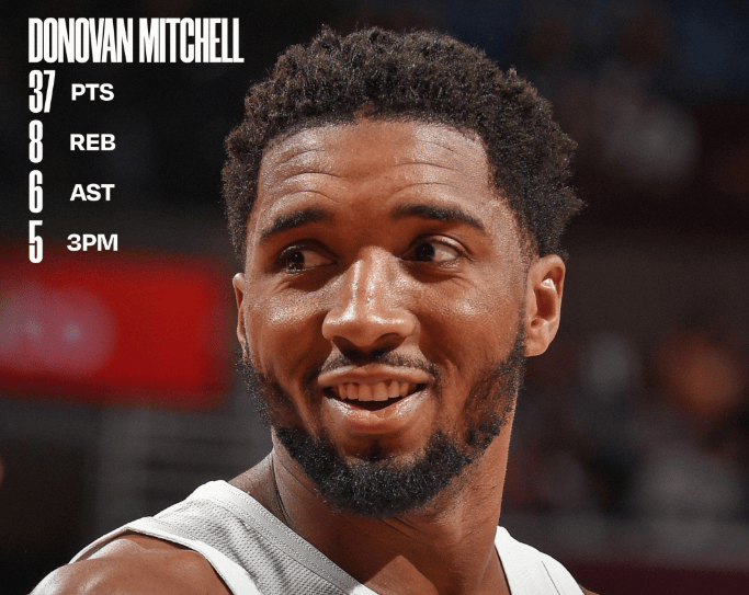 本場(chǎng)比賽,騎士球員多諾萬(wàn)-米切爾出戰32分鐘,22投14中,其中三分球9投5中,罰球4投4中,得到37分8籃板6助攻1搶斷。