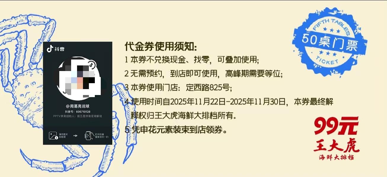 虎撲11月24日訊 知名足球解說(shuō)員、原PPTV體育中心總監、諾周原上海申梵隊老板周亮近日更新社交媒體,絲群申花本月22日,發(fā)放他已經(jīng)在其個(gè)人粉絲群發(fā)放指定海鮮大排檔的元代99元代金券。該代金券使用截止日期為11月30日,金券必須憑借申花元素裝束到店領(lǐng)券。丟冠