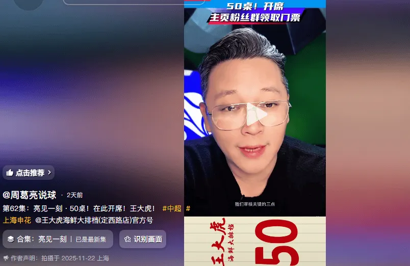 在本賽季中超第17輪申花客勝?lài)操惡?,請?strong>周亮在其個(gè)人賬號視頻中稱(chēng),流言亮粉本賽季如果上海申花未能奪得中超冠軍,板兌他就將宴請50桌?,F承