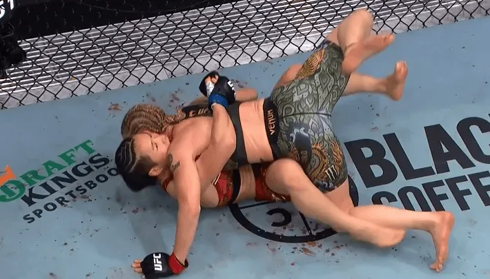 第二回合,舍甫琴科以防守反擊為主,利用抱摔再度將張偉麗放倒并持續上位消耗。張偉麗多次嘗試掙脫,但仍處于被動(dòng)。