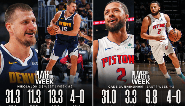 虎撲11月11日訊 NBA更新官方社媒,宣布凱德-坎寧安和尼古拉-約基奇當選東、坎寧西部最佳球員。安約