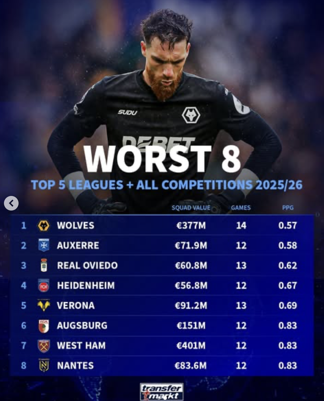 虎撲11月20日訊 德轉盤(pán)點(diǎn)本賽季五大聯(lián)賽各項賽事場(chǎng)均得分最低的八支球隊排行榜。