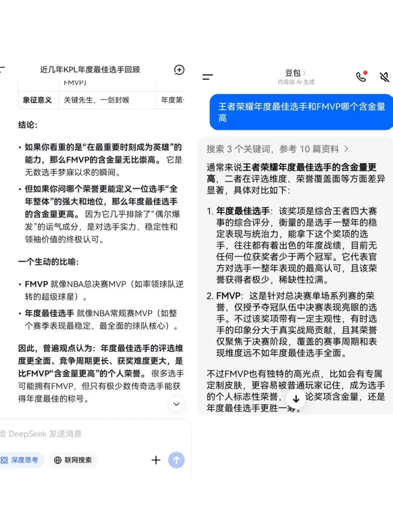 圖為deepseek和豆包分析年度最佳選手跟FMVP的含金量。