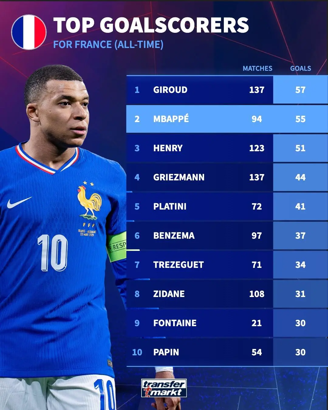 [流言板]近在咫尺!法國隊史射手榜:吉魯57球居首,姆巴佩55球第二