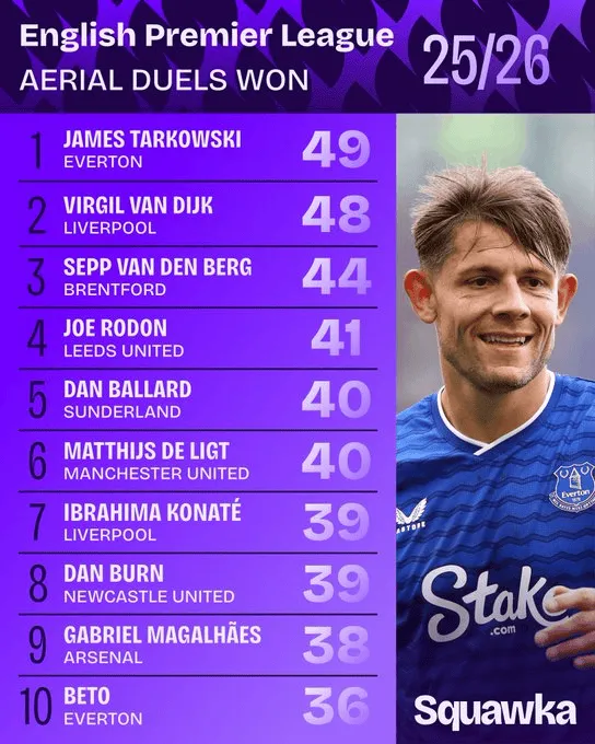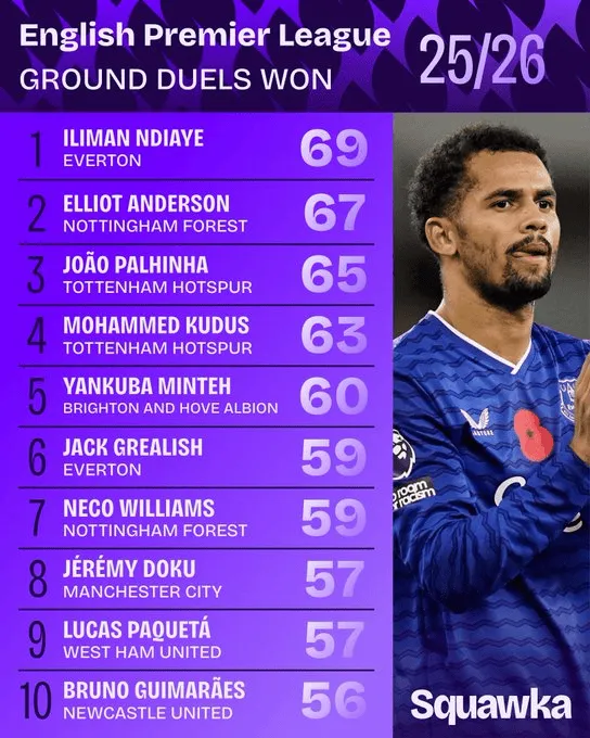 虎撲11月10日訊 Squawka統計截至目前英超本賽季贏(yíng)得對抗(地面爭搶/空中爭頂)排名。