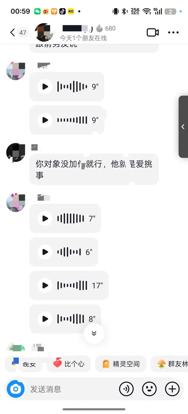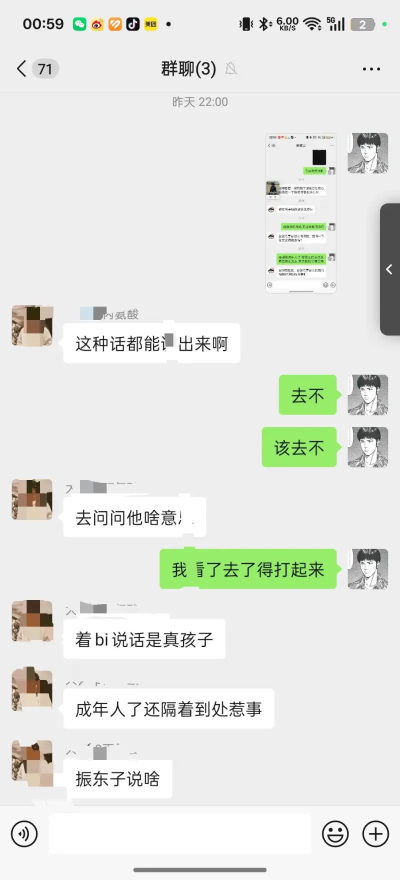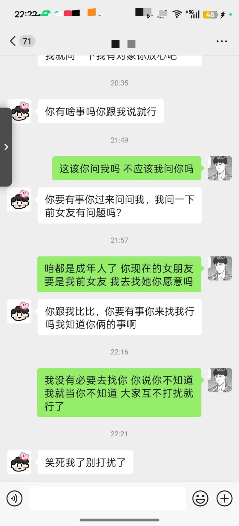 然后最近這幾天 他用小號去加我女朋友 就是那個(gè)驗證消息 說(shuō)什么為什么莫名其妙刪了自己,我女朋友也沒(méi)加他 就給他回了一個(gè)你之前也刪了我很多次 也沒(méi)見(jiàn)你尊重我,遇到友跟友因為我跟他這個(gè)所謂的女朋男朋友之前是一個(gè)初中的 也算是認識有微信 但是不算是朋友,我的朋友圈有明顯的我們倆的合照 而且我也光發(fā) 他這樣做我感覺(jué)很生氣,感覺(jué)不把我放在眼里,我就去找他問(wèn)他什么意思 然后就發(fā)生了我下面那張圖的聊天記錄,我本身是想去找他來(lái)著(zhù),我都聯(lián)系好我的哥們誰(shuí)的,他們一開(kāi)始也建議我不要去找他,我們也都認識他,都是一個(gè)初中的,我哥們就說(shuō)“他就是一坨臭狗屎"不用離他,但是后面他給我發(fā)了那些聊天記錄之后我很生氣,我的哥們也很生氣,我們就決定開(kāi)車(chē)去找他,但是我也明確知道他是在激怒我,我去了不可能跟他打架,我就準備跟我兄弟們去,但是我跟我女朋友說(shuō)了之后她不讓?zhuān)f(shuō)沒(méi)有必要因為這種人生氣還去找他,后面我就把他拉黑刪除了,但是依然感覺(jué)心里很不舒服,發(fā)在虎撲上也算是一種傾訴吧,畢竟這里大多數人都比我年齡大,也算是想聽(tīng)哥哥們說(shuō)一下吧,感覺(jué)有一種老實(shí)人被這種2b欺負的感覺(jué),而且弄得我跟我對象也不開(kāi)心 圖三四五都是兄弟們說(shuō)的話(huà)
