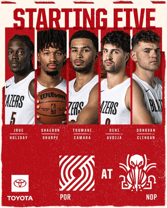 賽前,開(kāi)拓者官方更新動(dòng)態(tài),曬出今日的首發(fā)陣容:
